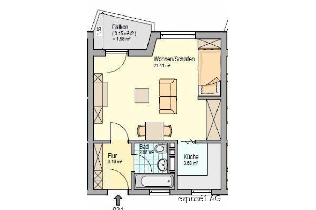 Sie betreten die gemütliche 1,5-Zimmerwohnung im 2. Obergeschoss über einen geräumigen Flur. Von hier aus erreichen Sie das Bad und das gorßzügige Wohn-/Schlafzimmer. Das Wohn-Schlafzimmer bietet Ihnen mit knapp mehr als 21 m² ausreichend Platz. Vom Wohnzimmer aus erreichen Sie eine kleine feine Küchenische und den Balkon. Das Bad verfügt über eine Badewanne welche zu einem entspannend Bad nach dem Arbeits- bzw. Studiumstress einlädt.