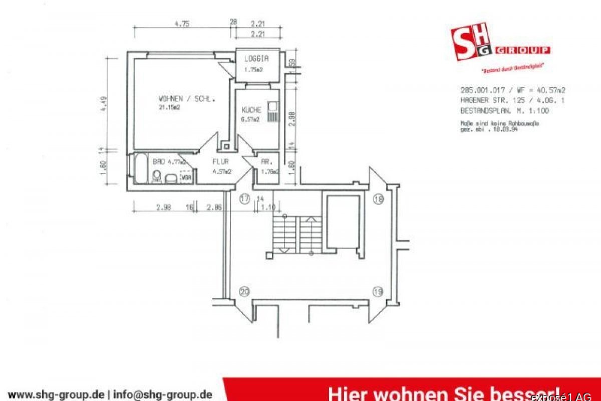 Die Wohnung hat eine Wohnfläche von ca. 40,39 m², die sich auf Wohn- und Schlafzimmer, Küche, Bad, Abstellraum, Balkon und Flur verteilen.